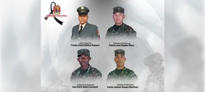 Los uniformados que murieron son el cabo segundo Fredy David Roble Romero, y los soldados profesionales Carlos Andrés Ramos Martínez, Iván Darío Reina Caravali y Fabián Reino Mora.