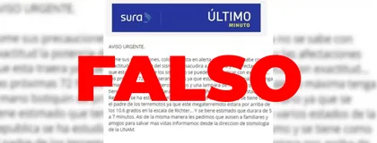 Muchas personas recibieron en su correo electrónico, o a través de redes sociales, un mensaje que usa la imagen de la EPS Sura, en el cual se advierte que, supuestamente, ocurrirá un “megaterremoto” en Colombia con una magnitud de 10,6 grados en la escala de Richter, y el cual duraría de cinco a siete minutos.