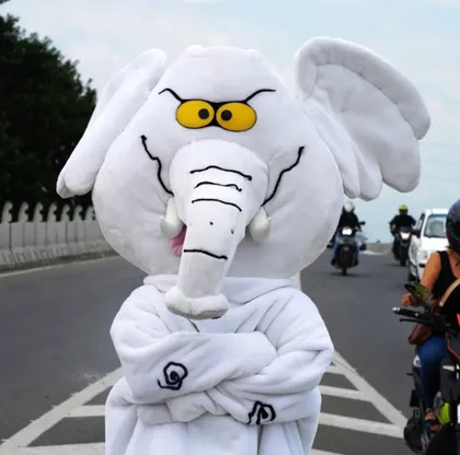 El protagonista de la inédita campaña es el ingeniero Luis Carlos Rúa, un ciudadano, anónimo hasta ahora, que desde hace cuatro años aparece vestido de elefante blanco en las redes sociales para denunciar el despilfarro de dinero público en obras inconclusas.